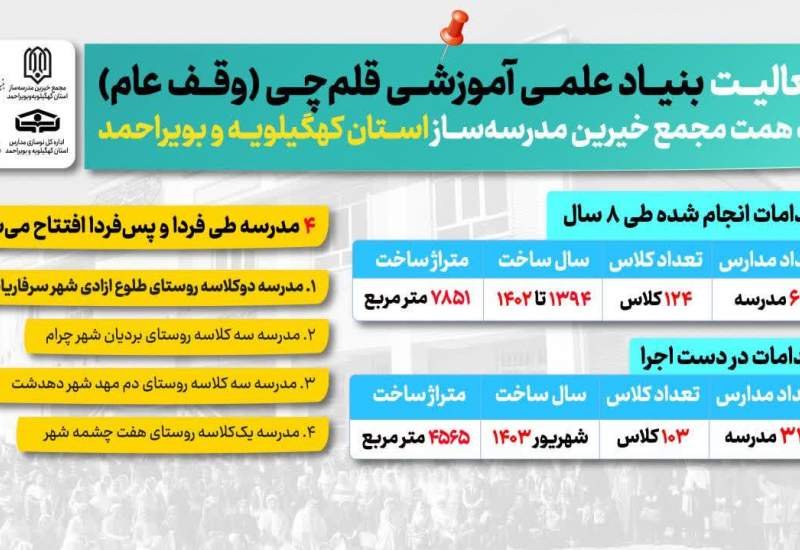 کانون علمی آموزشی قلمچی در ادامه فعالیتهای خیرخواهانه خود، چهار مدرسه جدید را در استان کهگیلویه و بویراحمد افتتاح نمود .این مدارس در شهرهای سرفاریاب، چرام، دهدشت و مارگون طی دو روز به بهرهبرداری رسیدند.