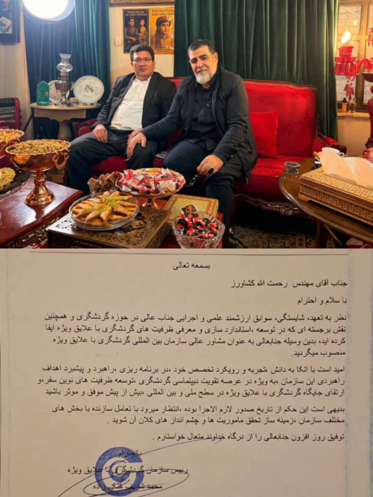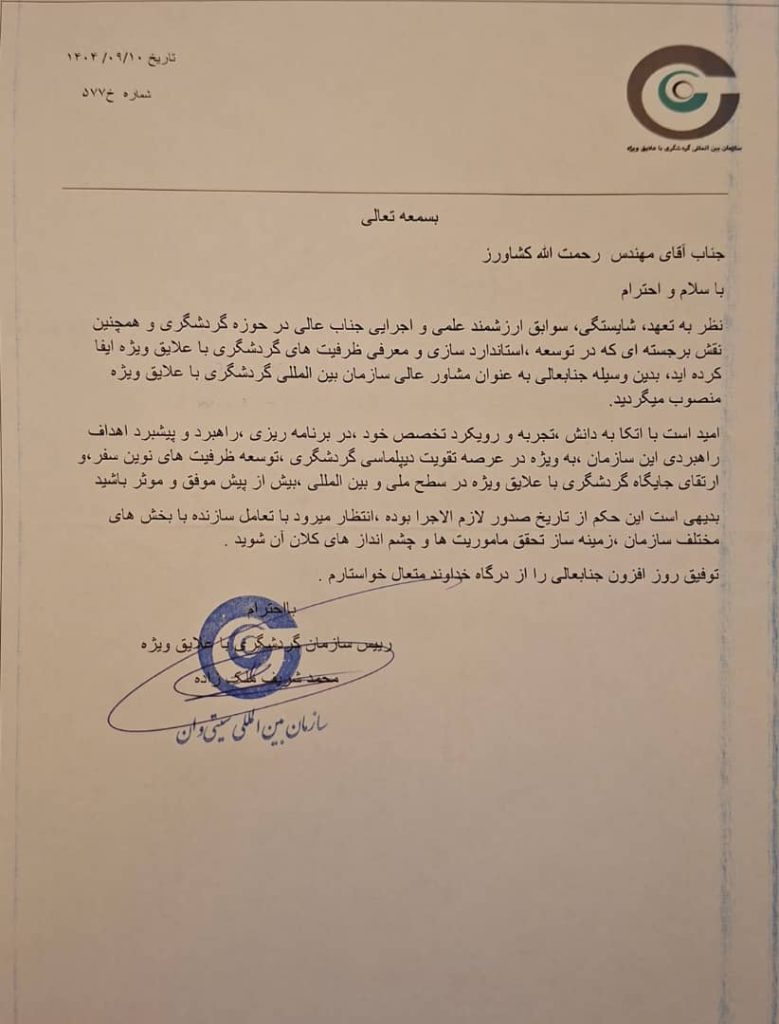 به گزارش پایگاه خبری دهدشت نیوز *طی حکمی از سوی دکتر محمدشریف ملکزاده، معاون رئیسجمهور و وزیر میراث فرهنگی و گردشگری در دولتهای نهم و دهم، سید رحمتالله کشاورز به عنوان مشاور عالی سازمان بینالمللی گردشگری علایق ویژه منصوب شد.