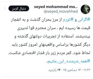 🔸واکنش سید محمد موحد، نسبت به وضعیت این روزهای بازار: کمر مردم زیر فشار اقتصادی شکست.
