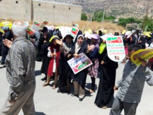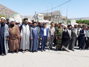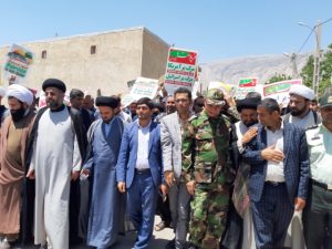 راهپیمایی کنندگان با سردادن شعارهای الله اکبر خامنه ای رهبر، مرگ بر آمریکا و مرگ بر اسرائیل حمایت خود را از مردم مظلوم فلسطین و آزادی قدس شریف فریاد زدند.